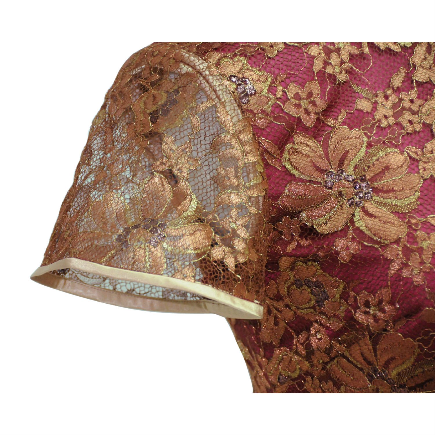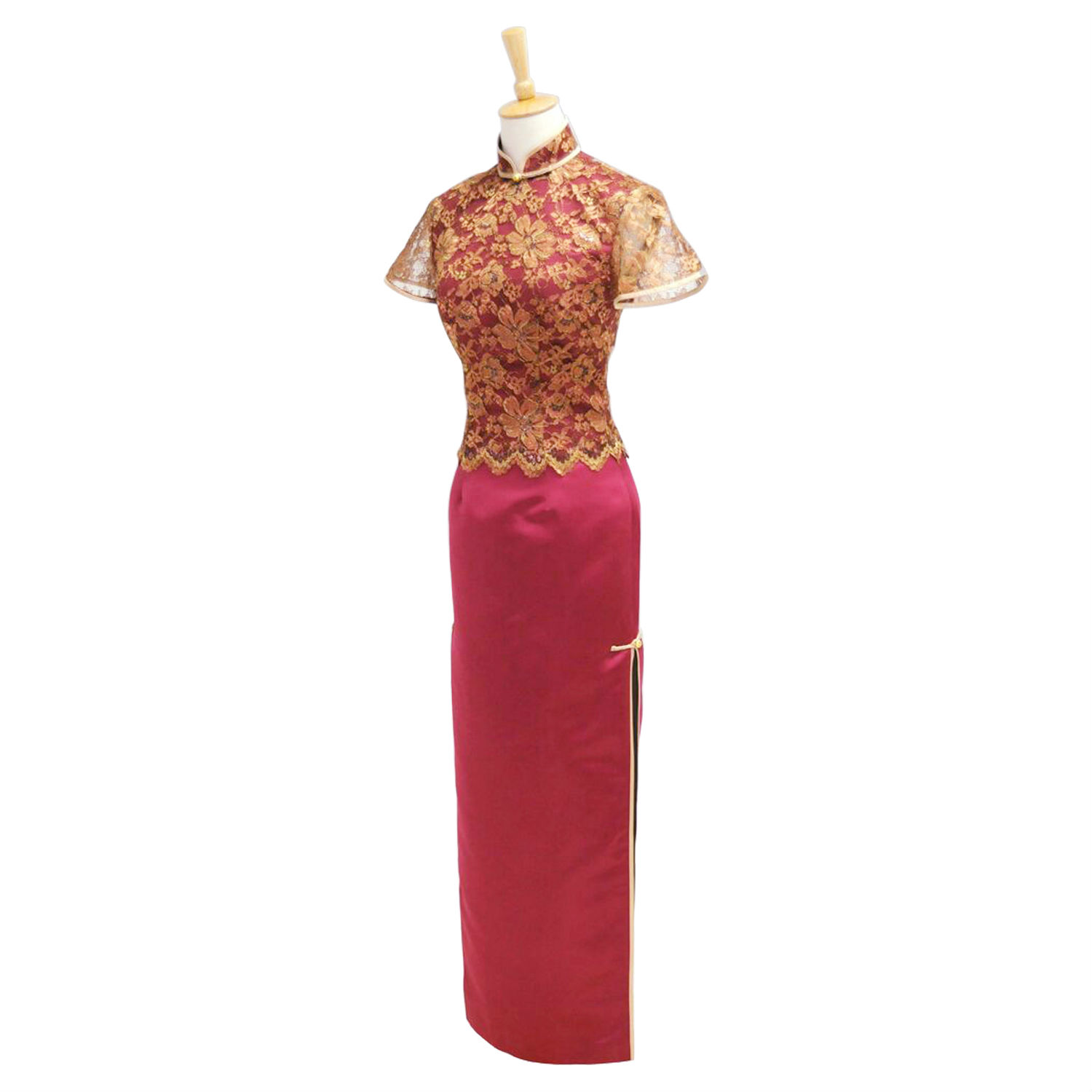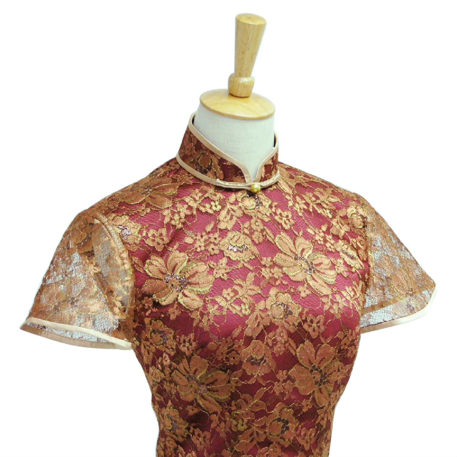 This cheongsam is a tight-fitting one-piece Chinese dress for women. The short-sleeve bodice is covered with gold-tone flower pattern, while the mandarin collar is fastened with a frog button for added appeal. This cheongsam creates a curvaceous silhouette to show off breathtaking femininity and sophistication.