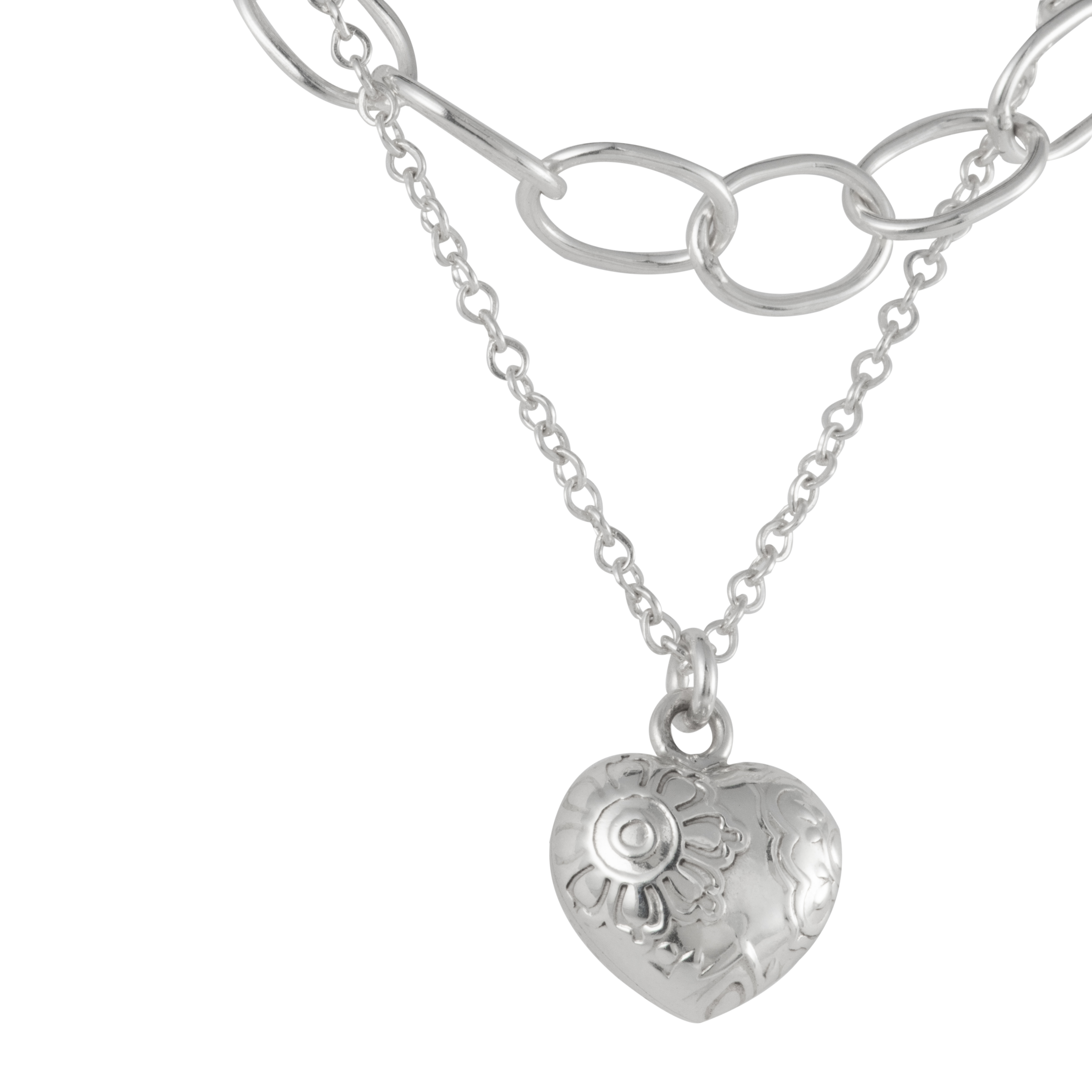 Design: Double chain with links and adorned heart pendant