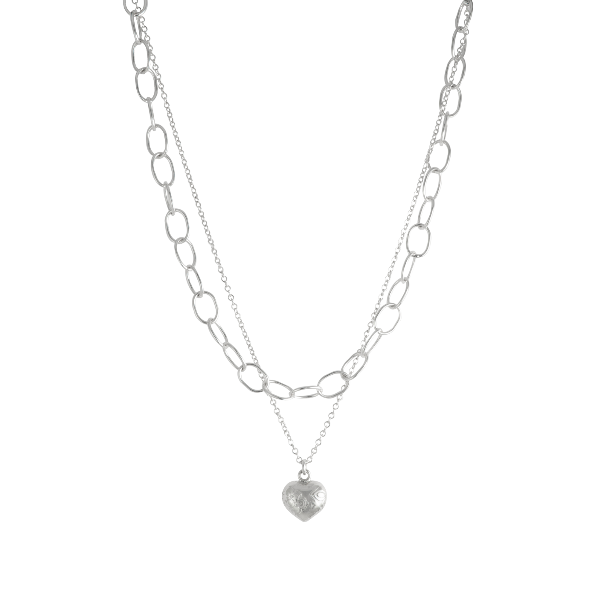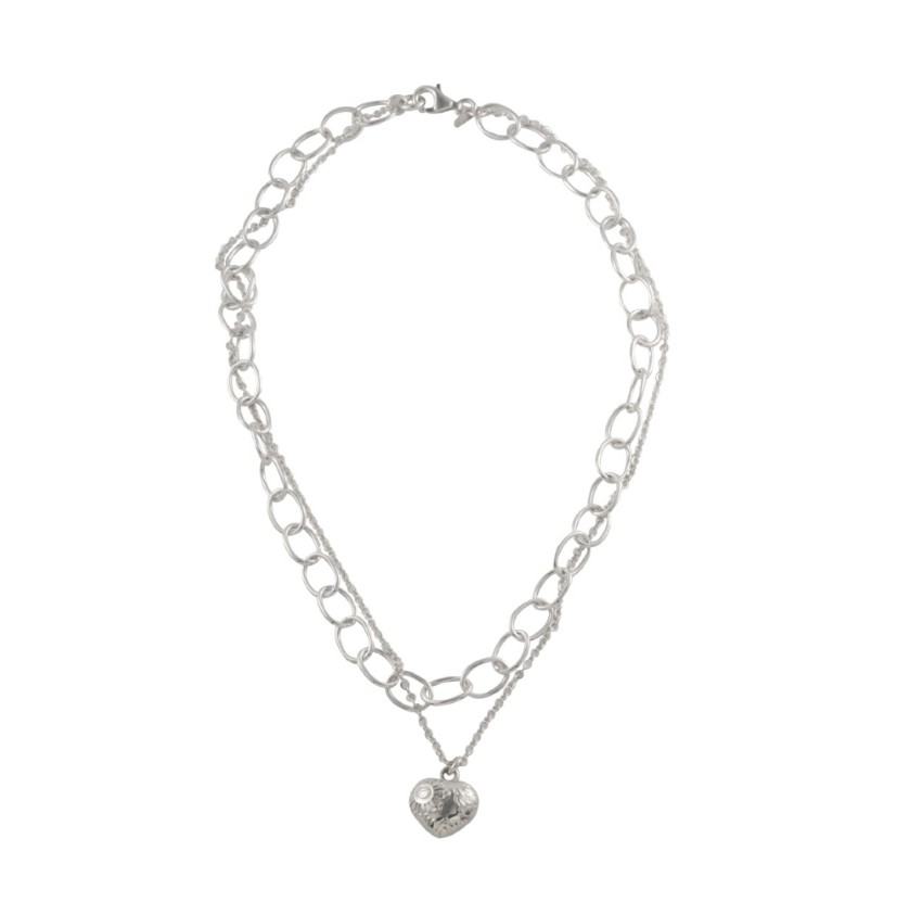 The cherny heart necklace, crafted in .925 silver, combines the strength of link design with the delicacy of a fine chain. Its double-chain style creates a balance between modern and classic, highlighted by a beautiful heart-shaped pendant adorned with unique engravings.
