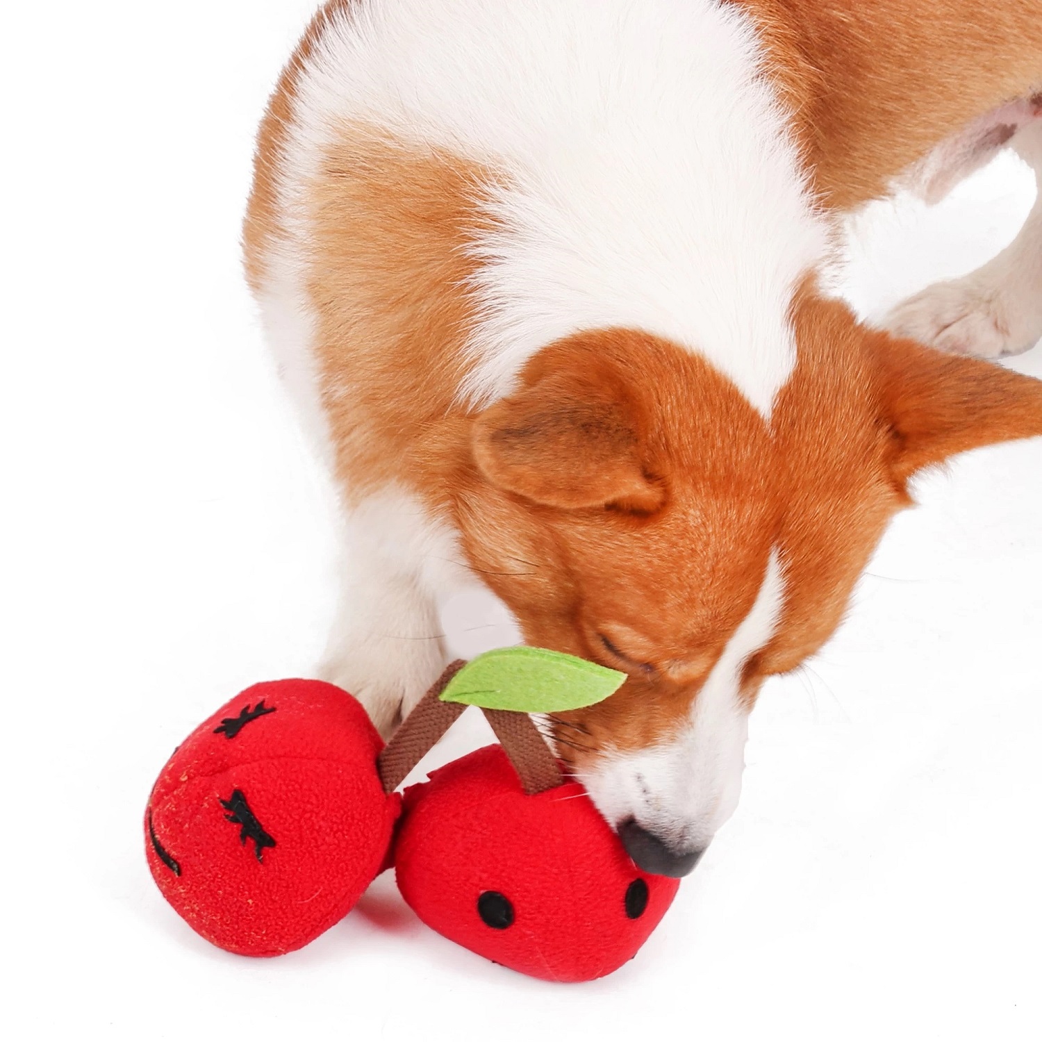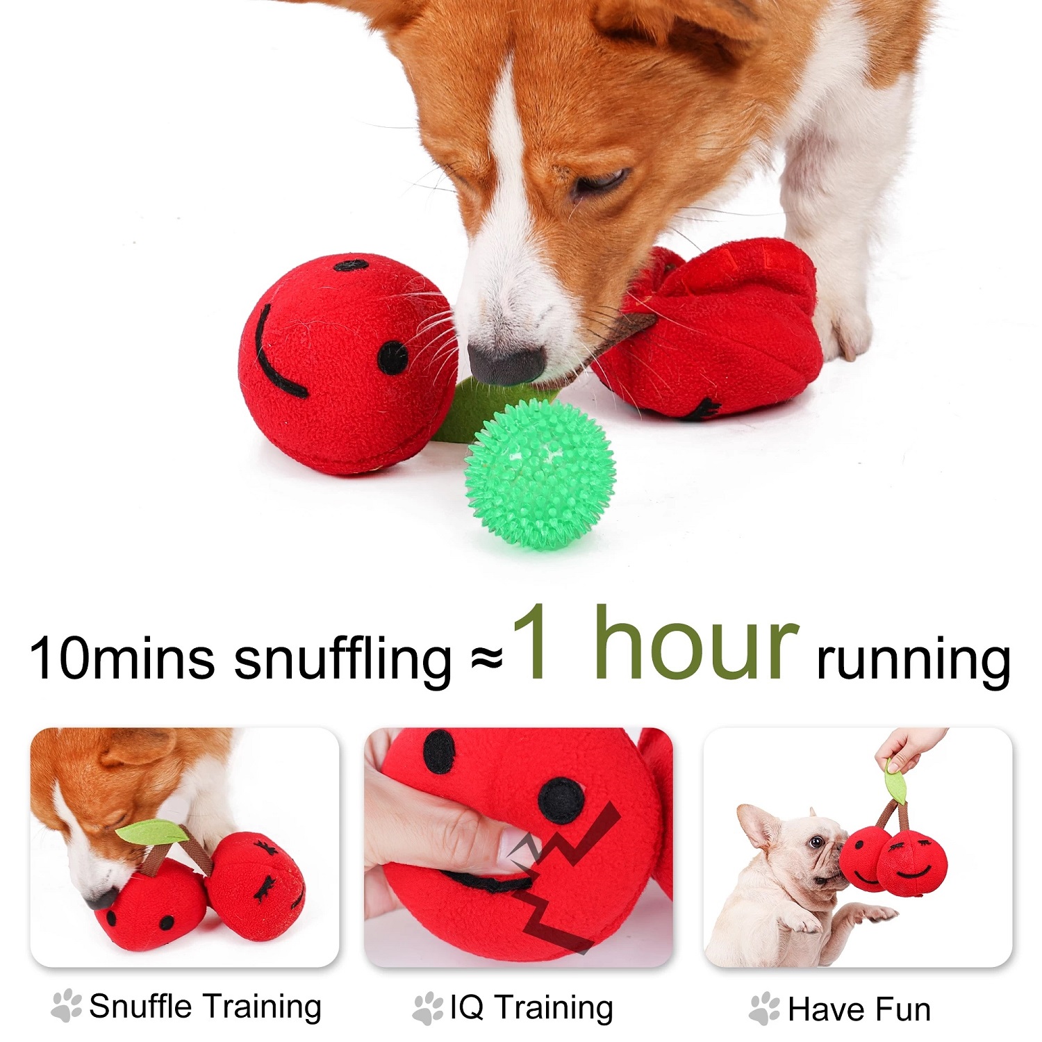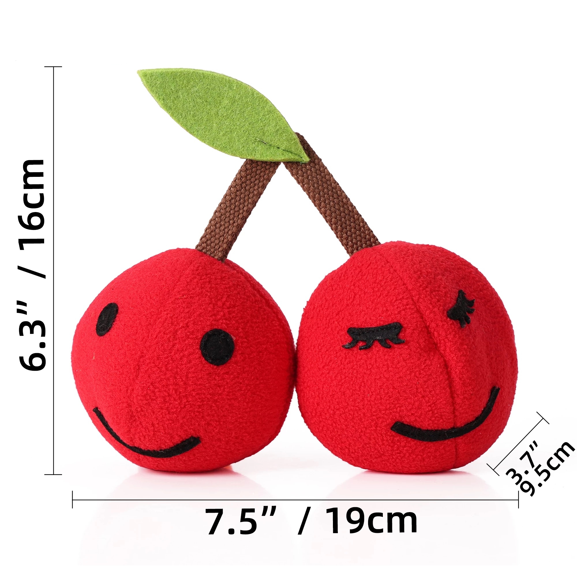 2. MULTI-FUNCTIONAL : One of the cherry toy is with a TPR dispenser, which is a durable toy for chewing. Our dog has to learn to pull out the chewing toy and reach the food inside. The other cherry toy is stuffed with polyester and a squeaker inside for drawing dog's attention and leading little puppy to make a sound.