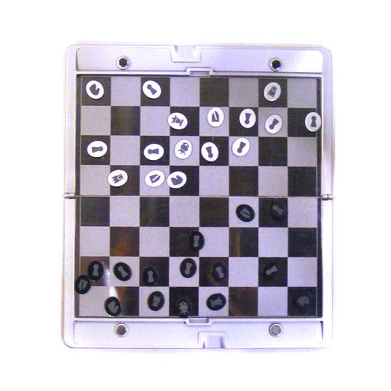 The featuring game is a magnetic chess set for two players to play together. It has a foldable board and pieces in black-grey and white-grey. It is a great and educational game for both children and adults.