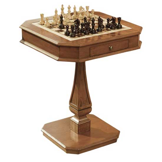 This chess table is finely crafted with a sophisticated wooden body. It is not only a professional chessboard, but also a solid piece of furniture. This gorgeous squared chess table is completed with drawers.
