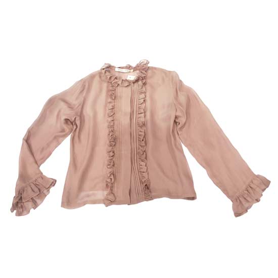 This chiffon blouse comes with a unique ruffled round-neck collar. The front bodice and cuffs are adorned with symmetrical pleats and ruffles. This chiffon dress raises the elegance of a lady in formal occasions.