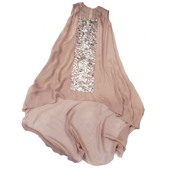 This sleeveless chiffon tunic is embellished with sequin leaves on the front. It comes with a chic hemline, showcasing a unique style. This tunic makes a must-have to your wardrobe.