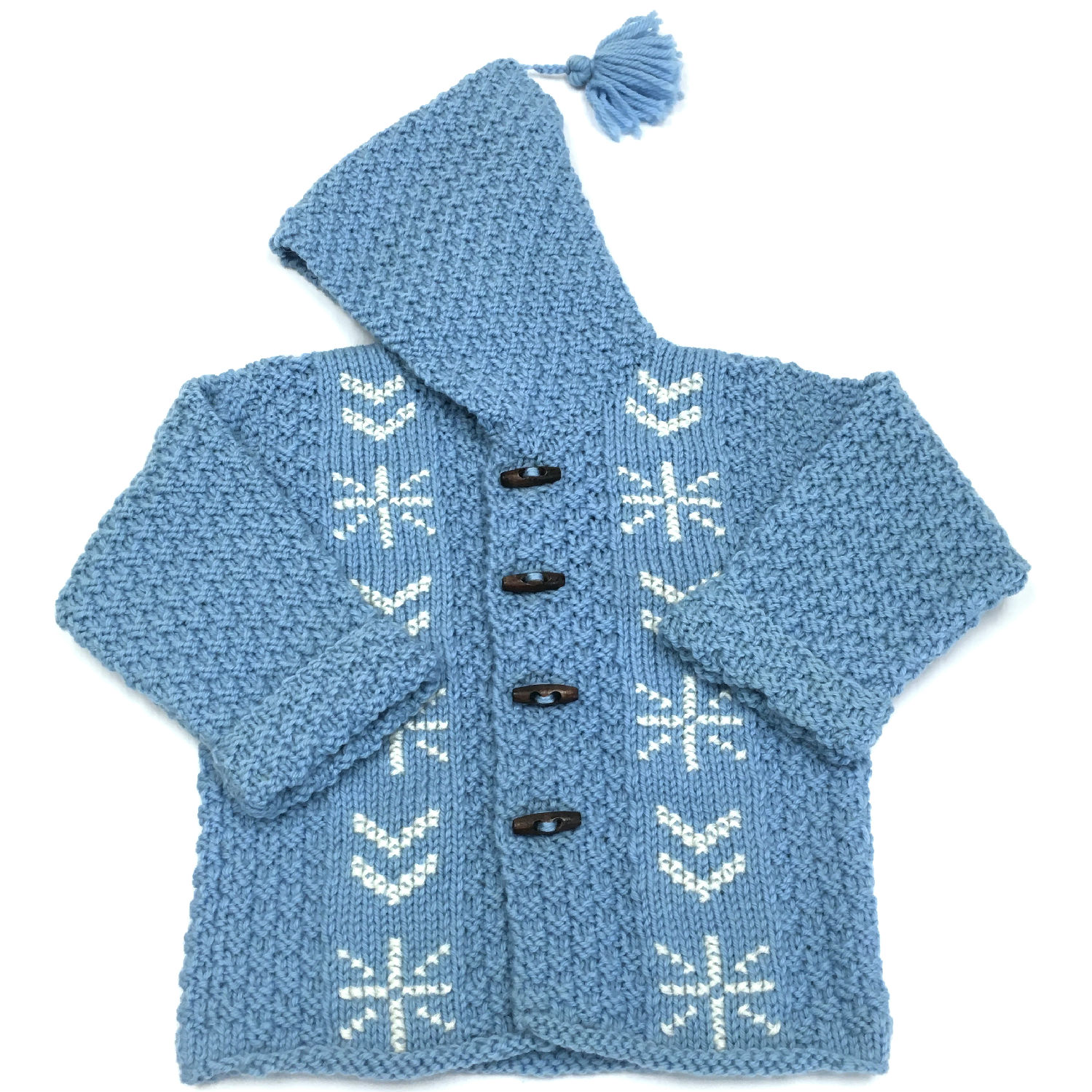Coming in a monotone all over, this crochet jacket is a simplistic option for children. This item features arrow motifs and four toggle buttons in the front, while a hood is made to keep the head warm. Made of fine wool, this jacket is no doubt warm and easy to care for.