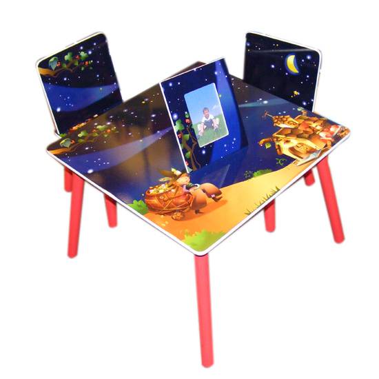 This is a children table set consisting of one table and four chairs. The chairs and the top surface of the table are printed with cartoon figures. The round table and chair corners can prevent unwanted hurt to children.