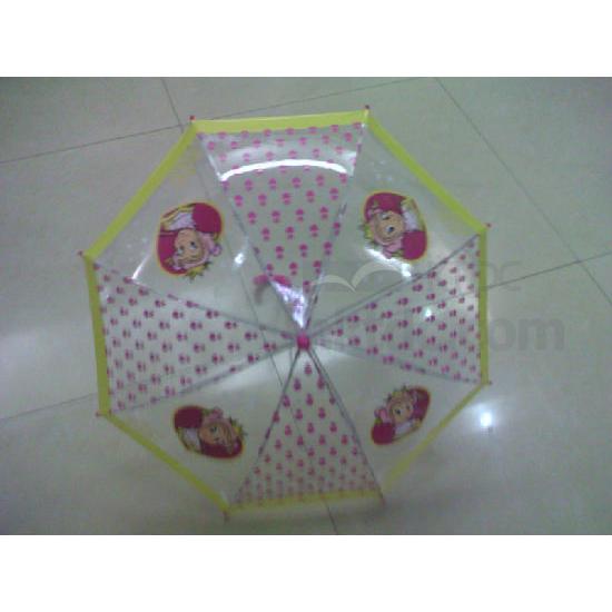 Lovely cartoon characters highlight the transparent canopy of this kids’ umbrella. It is well assembled by metal shaft and ribs as well as clear polyester fabric for durable structure. An adhesive band is further attached for easy opening.