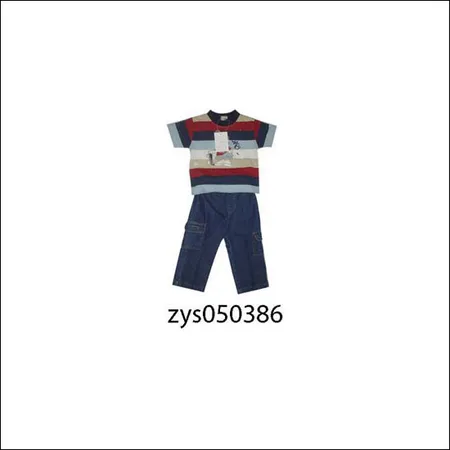 Let your boy enjoy a day out in this 2 pieces suit, completed with a striped tops and a pair of loose jeans. The short sleeved top features round neck and all over striped patterns with embroidered prints on chest front. The jeans are designed with loose styling featuring 2 flap side pockets.