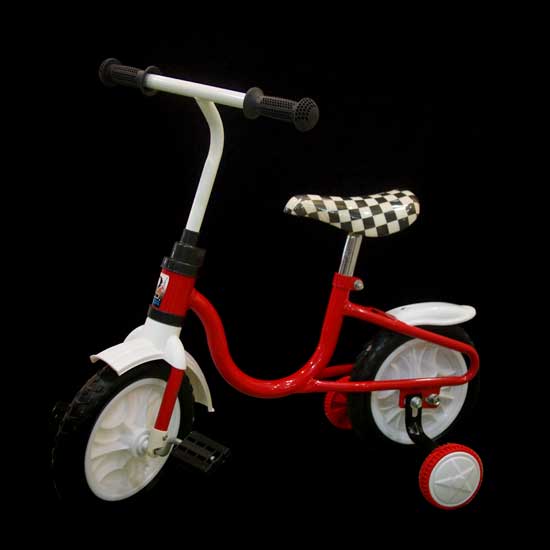 This is a stylish children's bicycle that features two supporting wheels for enhanced safety. The black-and-white plaid seat offers a tasteful touch. The soft hand bars ensure a comfortable and firm grip.