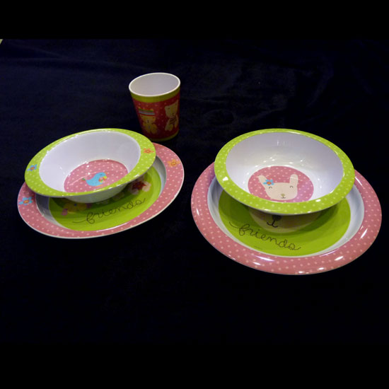 Shown here is a beautiful set of tableware designed for children. The dining set comes with bowls and plates with lovely cartoon prints. The colorful appearance makes an attractive choice for children.