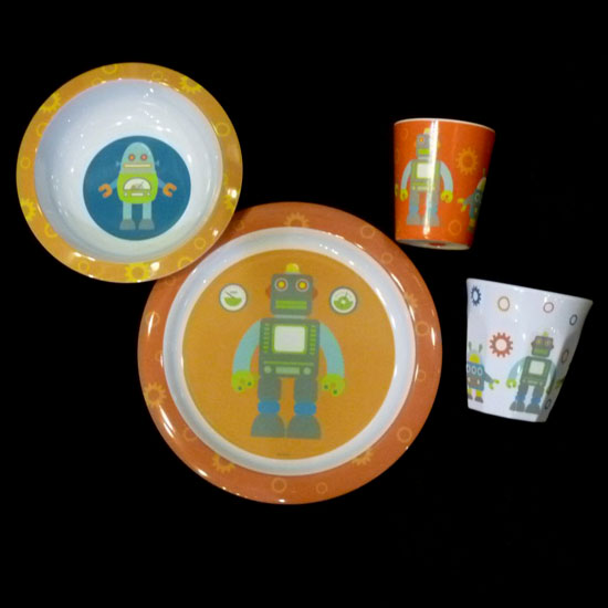 The dining set here comes with two cups and two plates. The design features cute robot prints in sharp orange and white. The lovely cartoon easily draws children’s attention.