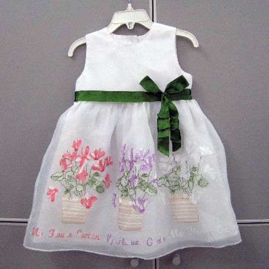 This children’s sleeveless dress in white features three delicate flowerpot patterns on the skirt. It is also fitted with a green belt with a ribbon bow at the waist. This snug one-piece dress makes your little girl look like a princess instantly.