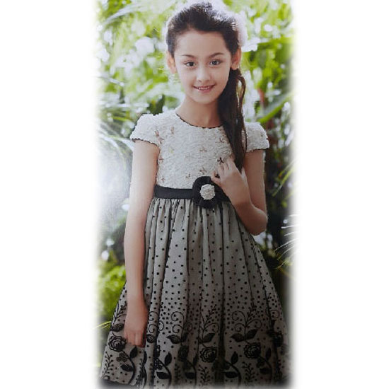 This is a children’s dress with a white bodice and a pleated skirt. The bodice comes with exquisite patterns with excellent workmanship. The skirt also features black patterns for a touch of style.