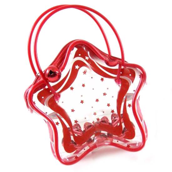 This is a children's handbag which is made of clear plastic. The handbag is star-shaped and equippe with handles for easy carrying.