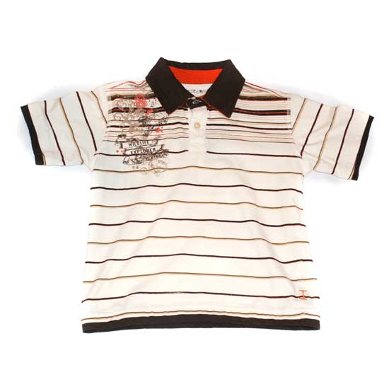 Showcased here is a children's polo shirt in white. It flaunts a simple yet charming design with allover horizontal stripes and a printed pattern on the chest. Made of breathable fabric, this polo shirt provides exceptional comfort for wearing.