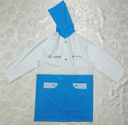 This is a comfy raincoat specially designed for kids to wear. It features a blue hood, a button-up front closure and two side pockets. The combination of light blue and creamy white showcases a refined look. It is an ideal choice for rainy days.