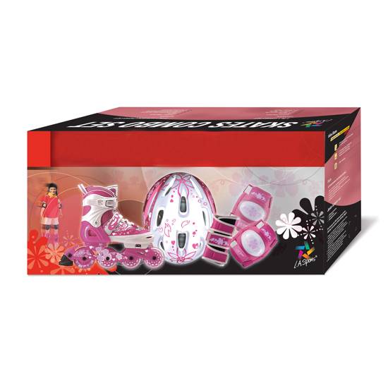 This is a 3-in-1 kids' skating combo set. Going skating is an interesting sports activity. The whole skating combo set comes in a pink colour that suits girls very much.