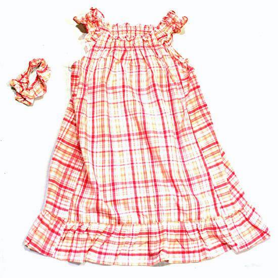 This dress features delightful checked patterns formed by red, yellow and white colors. The sleeveless design and the ruffled neckline showcase the energetic spirit of children perfectly. This cute dress provides great wearing comfort in summer.
