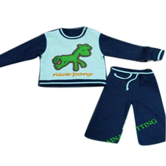 The children's sports suit has a round-neck, long-sleeve T-shirt and a pair of long pants. The pony pattern adds a cute touch to the suit. This suit is ideal for children to wear at home and for sports activities.