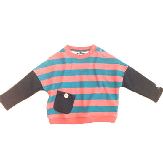 This is a children’s T-shirt with long sleeves, a pocket and a round neckline. It is made of 100% cotton to ensure wearing comfort. This cotton T-shirt is designed with striped patterns for an eye-catching look.
