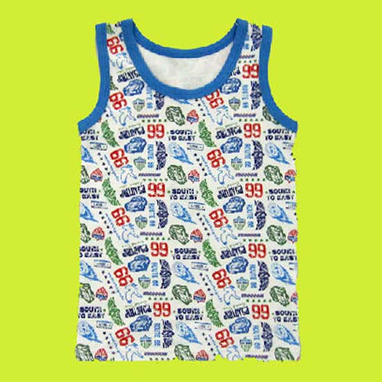 The displayed tank top is designed for kids. It comes with allover attractive patterns and blue details at the neck and the rims. This snug tank top completes your kids’ casual looks easily.