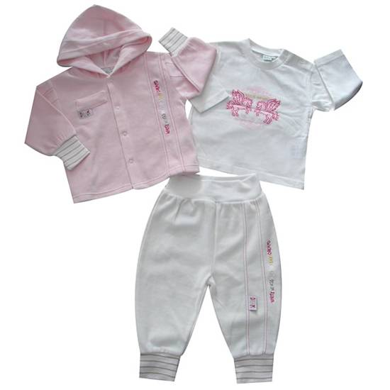 The featured item is a set of clothes for children. The set includes a hooded jacket, a shirt, and a pant. This set is suitable for smaller children.