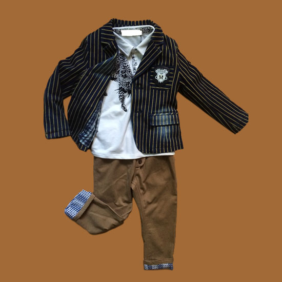 This is a set of children's wear with a fashionable and handsome design. It comes with a black jacket, a white T-shirt and a pair of brown pants. The jacket comes with stripe patterns for a touch of style.