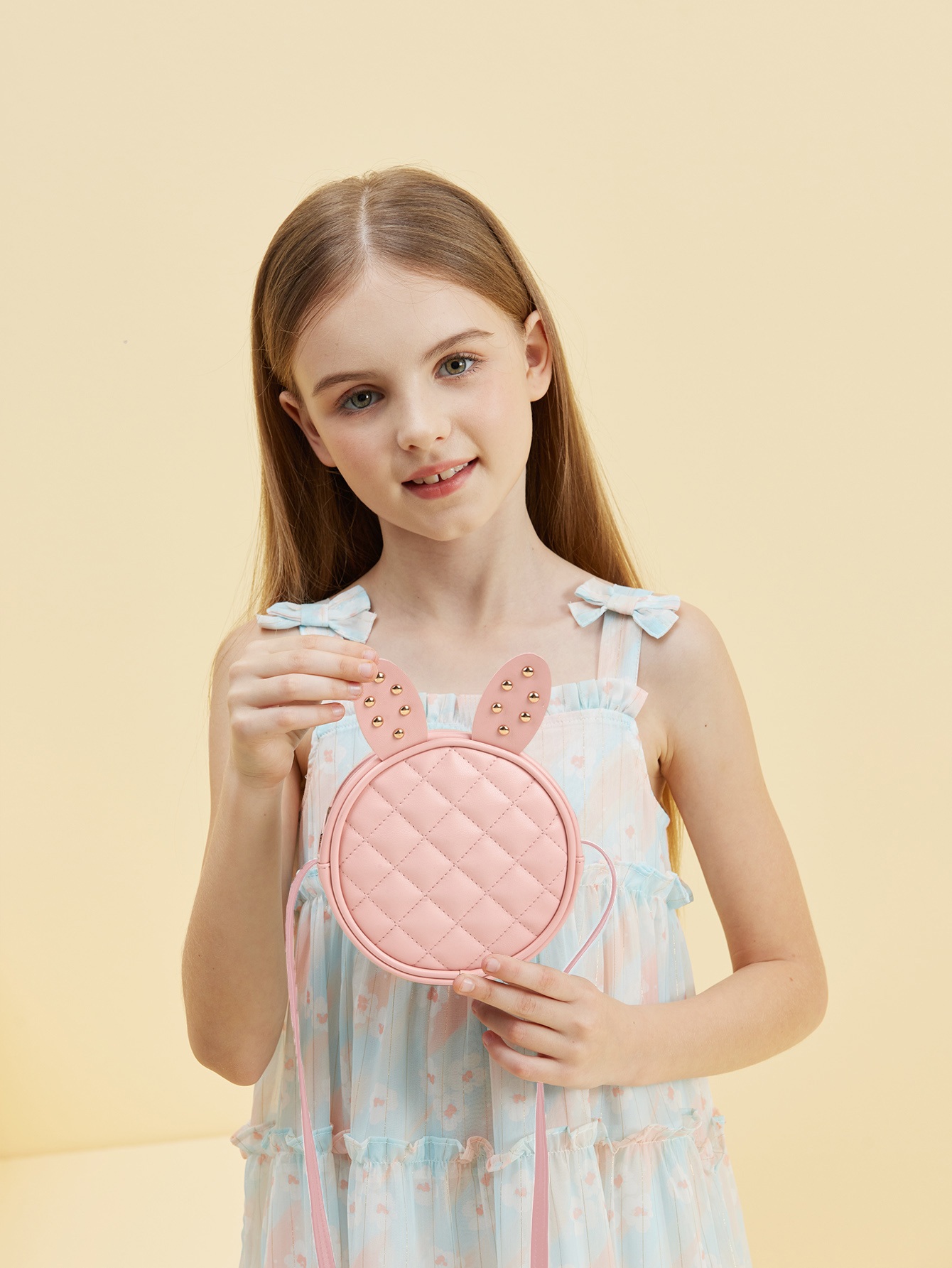 The white quilted rabbit ears round crossbody bag is a stylish and fun accessorydesigned for kids. This bag as a whole adopts a pure and flawless white tone,through the delicate quilting process, to create a rich texture effect on the surfaceof the bag body, increasing the sense of three-dimensional and quality.