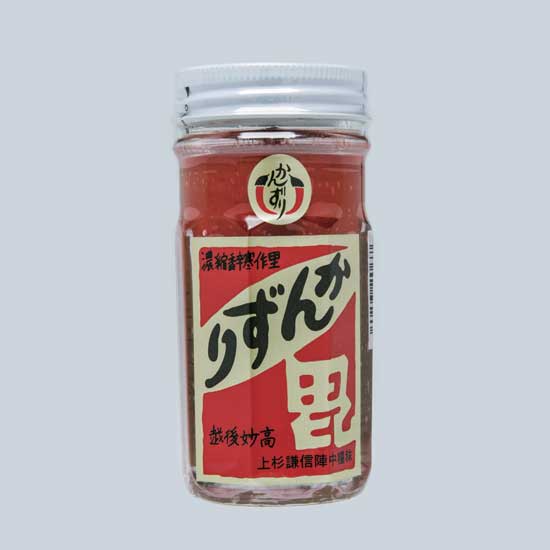 Displayed is a bottle of chili sauce made in Japan. Kanzuri chili paste is a pungent but mild relish with a multi-layered flavor that is refined with a profound spiciness.This delicious chili sauce is a good seasoning for dishes of all kinds.