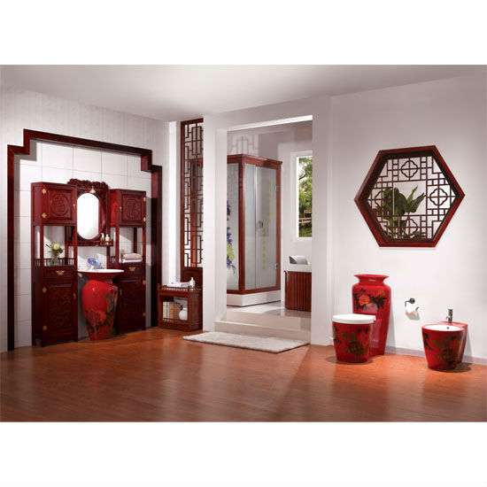 Imbue your bathroom with Chinese elegance by choosing this set. Its items include sink, bathroom cabinet, shower cabin and rack, all of which are exquisitely made with great workmanship. The bathroom cabinet is engraved with elegant patterns and the Chinese character of "happiness," while the sink is garnished with dainty floral patterns. The set is an excellent blend of modern bathroom accessories and traditional Chinese aesthetics.