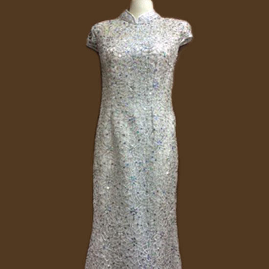This Chinese cheongsam comes with a silvery finish. It is adorned with intricate floral patterns for an elegant look. This curve hugging dress is ideal for formal occasions and balls.