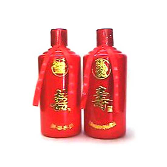 Displayed is a bottle of Chinese wine for weddings. Featuring a sharp red color, this wine has a distinctive taste that is awakening. This high quality Chinese wine is an ideal choice for treating guests during weddings.