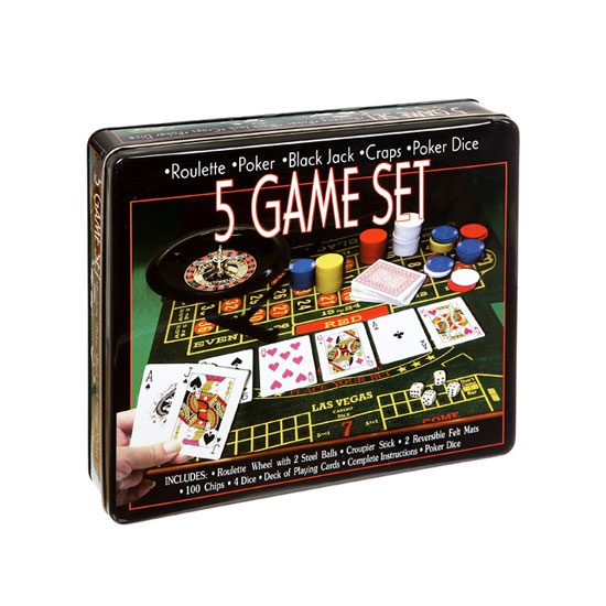 This is a five-game set in a color box. This chip set comes with 100 chips, decks of playing cards, a roulette wheel, 2 balls and so on. This professional game set is fun to play with.