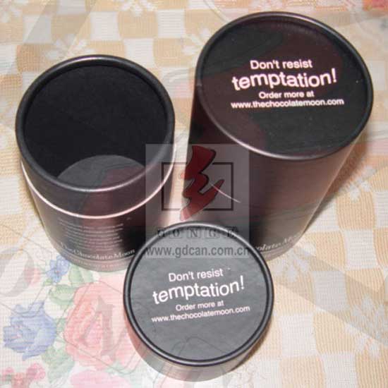 Featured here is a cylindrical-shaped chocolate box in a matte black finish. The paper box is finely printed with customized advertisement and logos on the exterior. The functional box can keep chocolate from humidity and sunlight.