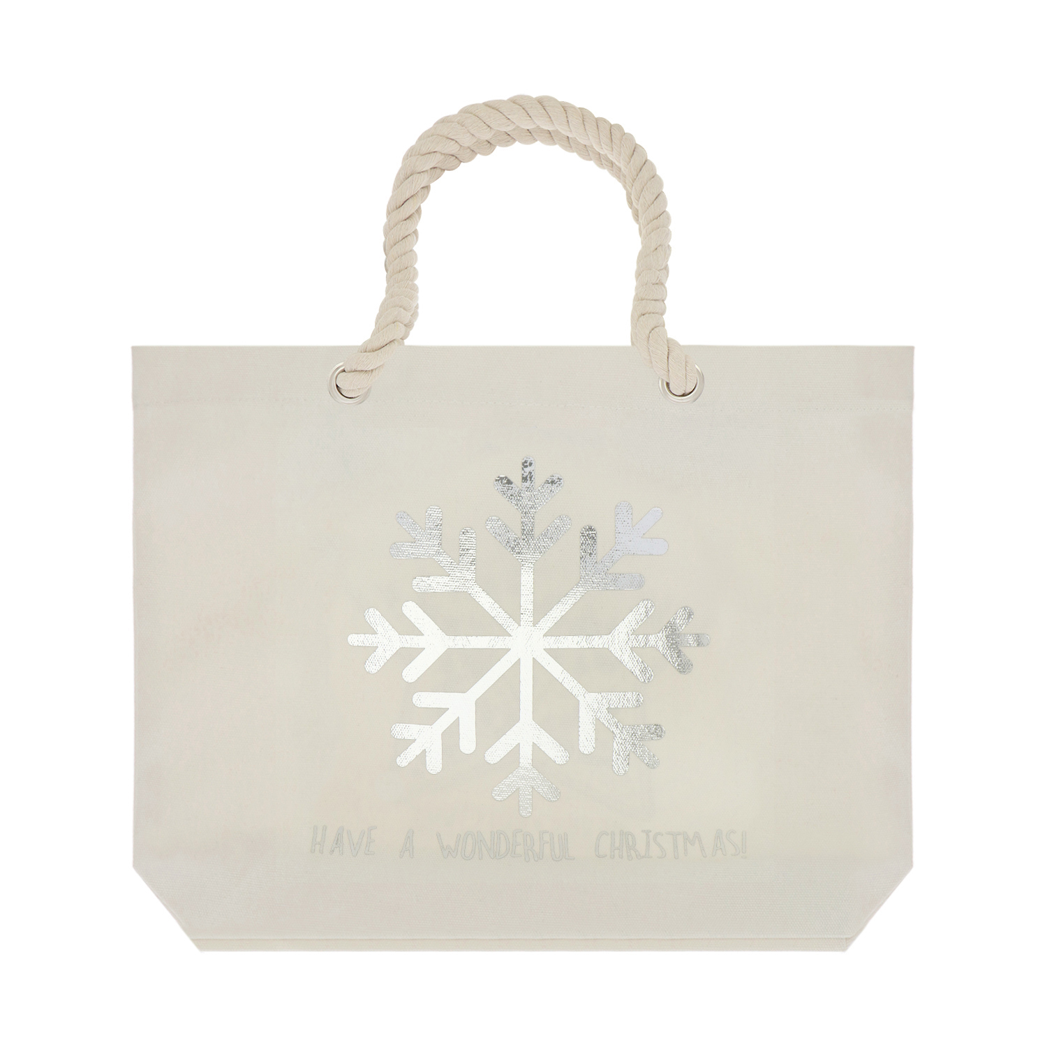 Take this cool tote bag back home for your personalized collection of Christmassy items. Sturdy dual handles in hempen rope match perfectly with the durable cotton canvas body to give a functional bag. Christmas-themed motifs enclosed by a big snow in silvery tone appeal to most young fashionable ladies.