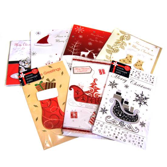 The picture shows seven handmade Chrismtas cards with luxurious and glittering ornaments on the covers. They are featured with different Christmas items such as reindeers, stocking and gift.