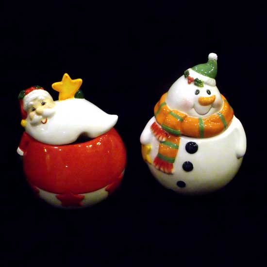 Displayed here is a Christmas ceramic tableware set with excellent-quality paint finish for a more appealing look. The ceramic containers in the looks of a Santa Claus and a snowman are perfect for decorating your dining table during the Christmas time.