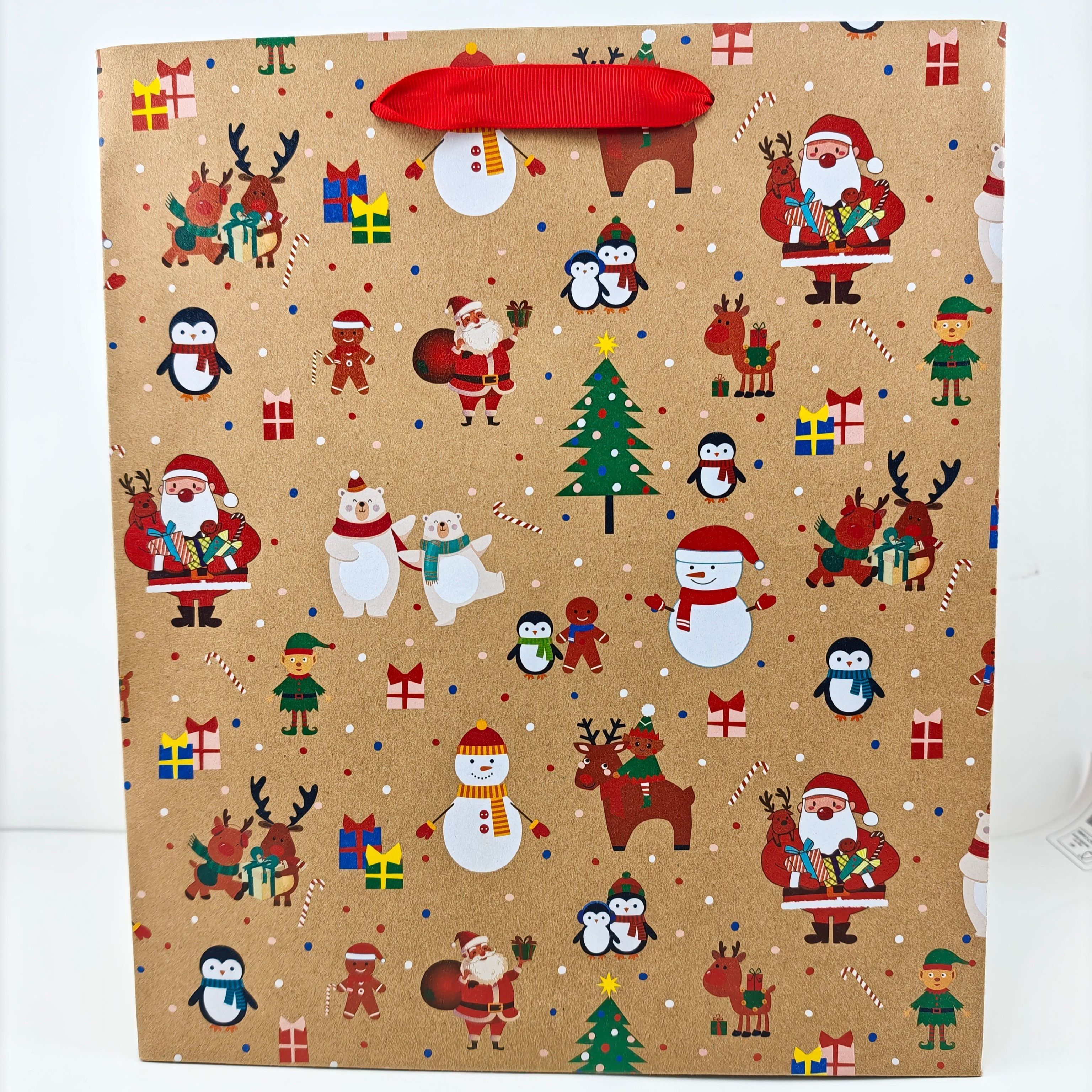 This is a gift bag using a combination of four-color printing and white ink printing. The whiteness of the white ink on its surface is extremely high, making it very eye-catching.It is made of kraft paper, and the surface pattern features Christmas elements, which further enhances the festive atmosphere.