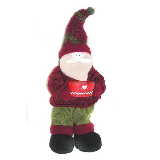 This is a well designed Chirstmas decoration. It is a standing Santa Claus holding a red gift box. The standing Santa is wearing a knitted red hat, a sweater, a green trousers and a pair of black shoes.