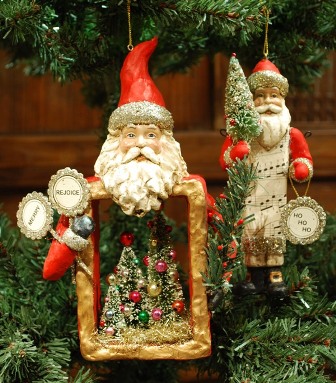 Bring back old memories with this nostalgic Santa ornament. It features a paper pulp Santa with sisal tree vignette and adorned with sparkling glitter details. This Santa ornament is all hand assembled and is perfect for using as a Christmas gift.