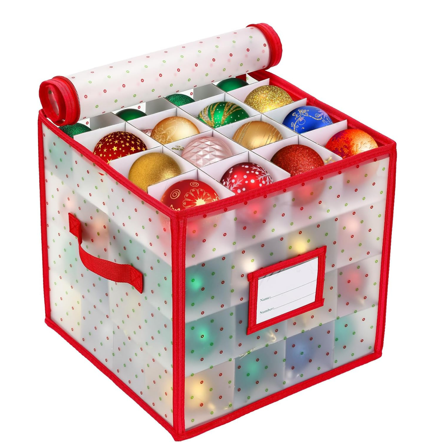 This Christmas ornament storage box includes customizable dividers, allowing you to store up to 64 three-inch or 36 four-inch ornaments with ease. The adjustable grid design helps you organize various ornament sizes while keeping them neatly separated and protected.