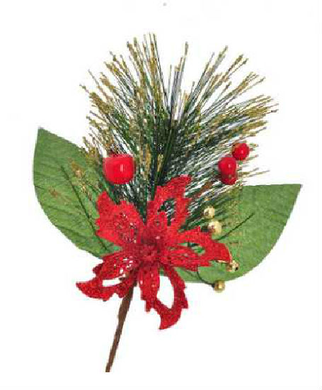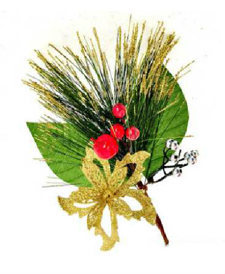 This Christmas pick is crafted of green leaves, red berries and a flower in a glittery gold tone. It flaunts long lasting beauty and is easy to care for and maintain. The Christmas pick is excellent for decorating Christmas trees and can be reused every Christmas.