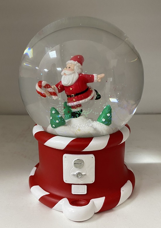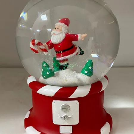 Polyresin/Glass Santa snowglobe with candy machine base & with wind-up music