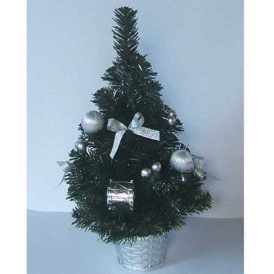 Featured is a mini-size standing Christmas tree with a braided basket. It is adorned by silver-toned decorations such as ribbons and Christmas balls. Add a festive flair to your house with this tree this Christmas season.