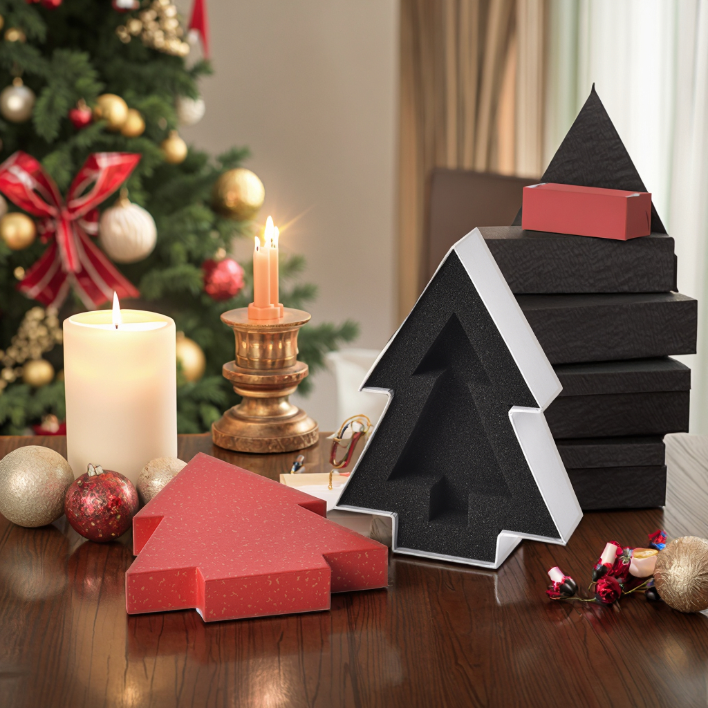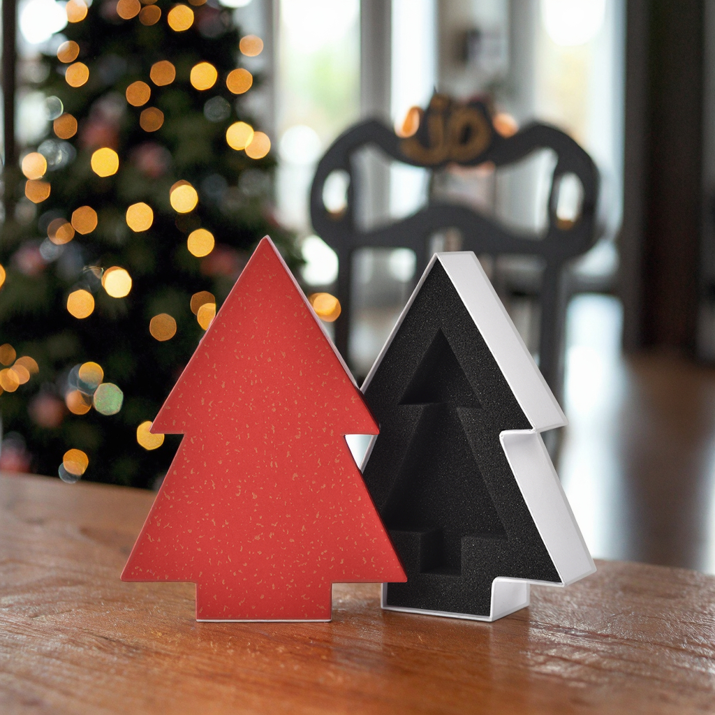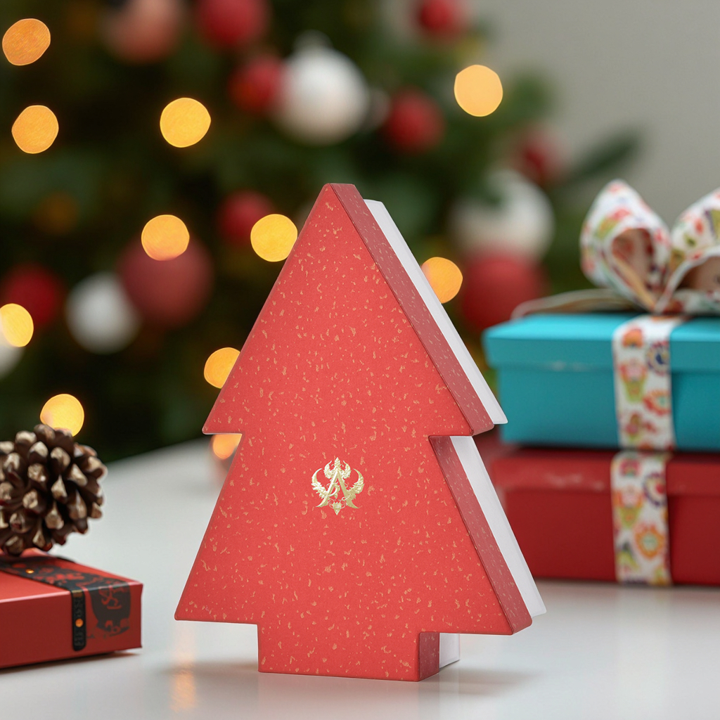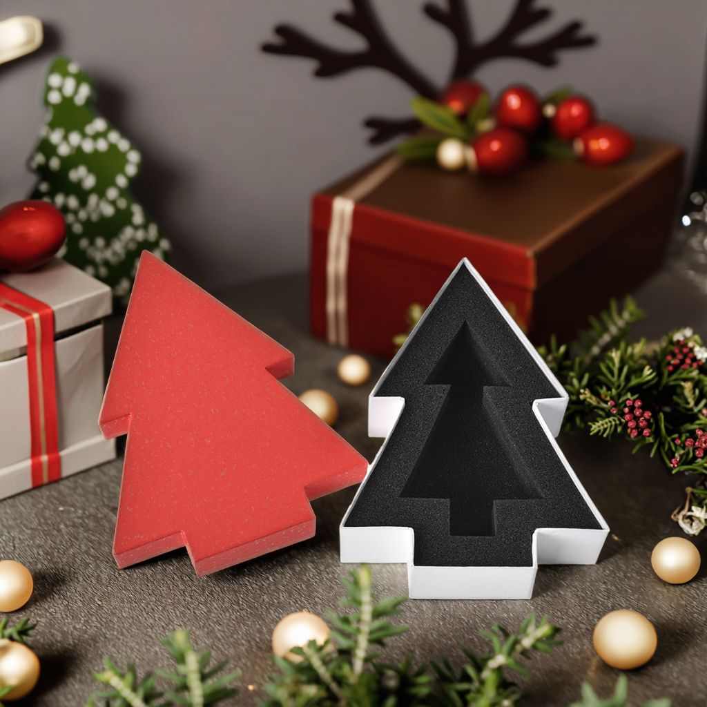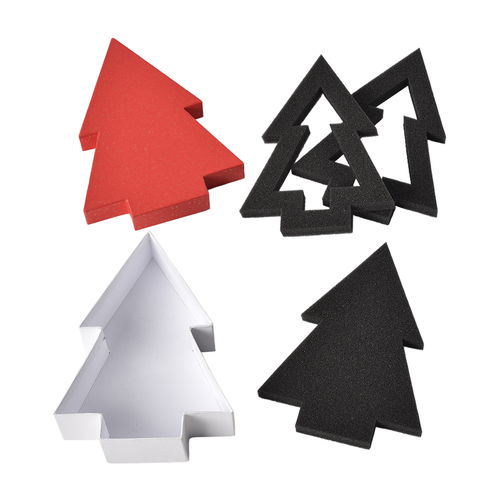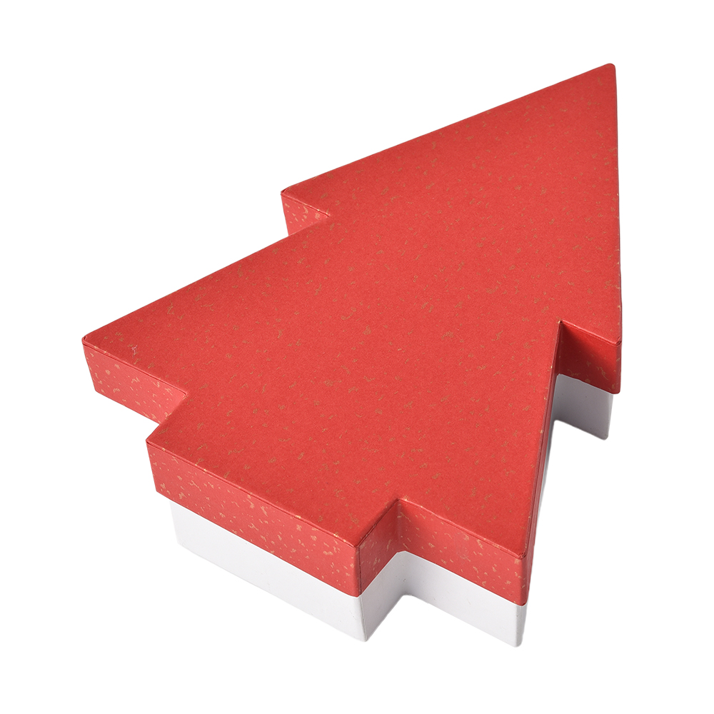 A delicate and unique Christmas tree-shaped gift box. It adopts an upper and lower cover design, which can be used as both a festival gift package and a jewelry storage box. The box is equipped with custom inner lining sponge to perfectly protect valuable items.Hot gold decoration adds luxury. The classic color combination of red cover and white background is full of festive atmosphere. It also supports fully customized design.