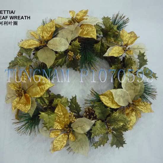 The wonderful mix of artificial Poinsettia and Holly leaves makes a perfect wreath for decoration use. The golden Poinsettia demonstrates the sense of magnificence in the holy festival and would be the best item at Christmas time.