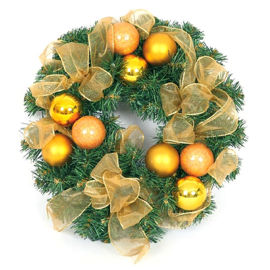 This is a Christmas wreath coming with green leaves and baubles and ribbons in a golden color. The wreath is made from top quality PVC and plastic for long lasting and repeated use. Bring festive joy to your home with this Christmas wreath.