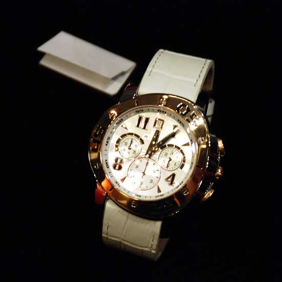 Presented is a beautifully crafted analog watch that boasts a chronograph movement. This three-hand analog watch flaunts a classy design. The watch case is made of quality metal and plated in a golden color. The white stitched leather showcases a sense of elegance. The white-tone dial is marked with triangular Roman-numeral hour markers in a dainty way.
