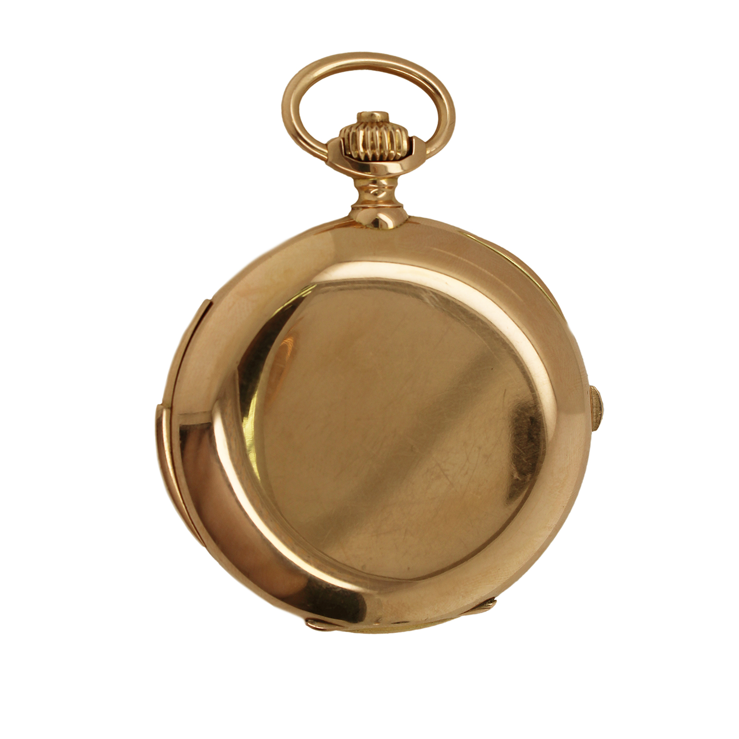 Case: Signed, round, 18k pink gold, hunting case no. 195581 measures 54mm, weighs approx. 138g, and features an 18k cuvette, latch on bezel to set time by 4 o’clock, minute repeating slide to the band by 6 o’clock, and pusher to activate chronograph on band by 12 o’clock.