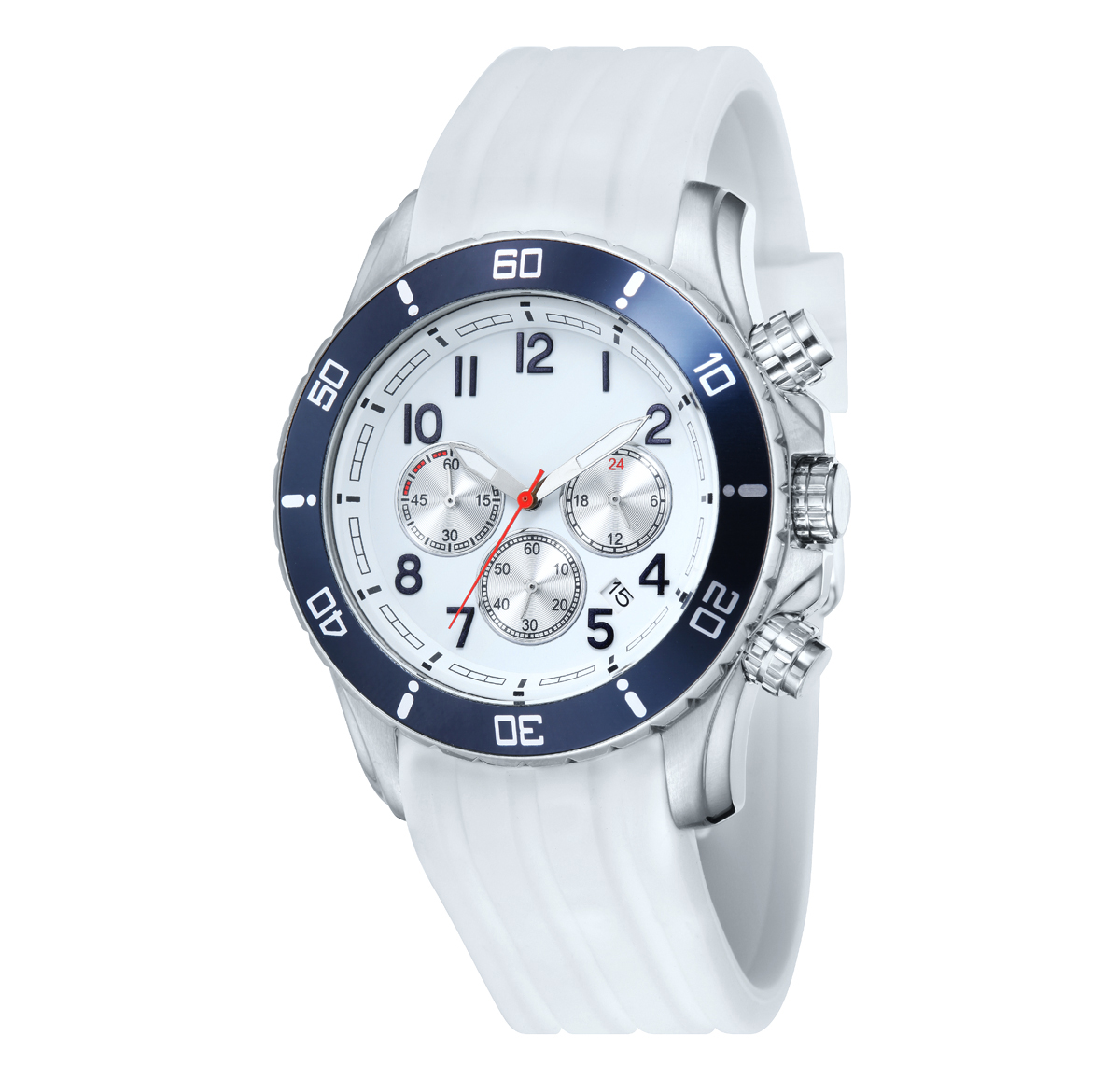 Stainless Steel Case • Chronograph Movement with Date Function • Printing Dial + Applied index • Silicon Strap • 5 ATM • Case Size: 46mm